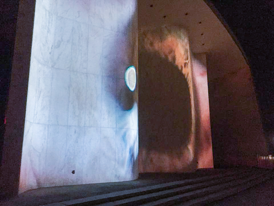 This work is both my exploration of projection mapping technology and my experiment on public space installation. I transform the 27m x 12m(90ft x 40ft) wavy white facade into a moving canvas at night. By projecting a video illustrating my mental state during a panic attack diving in the ocean, I juxtapose this private experience with the collective viewing setting. Audiences are presented with the option of wearing bluetooth headphones to be further immersed. The curved wall reinforces the sense of visual distortion of the near-death experience highlighted in the video projection.